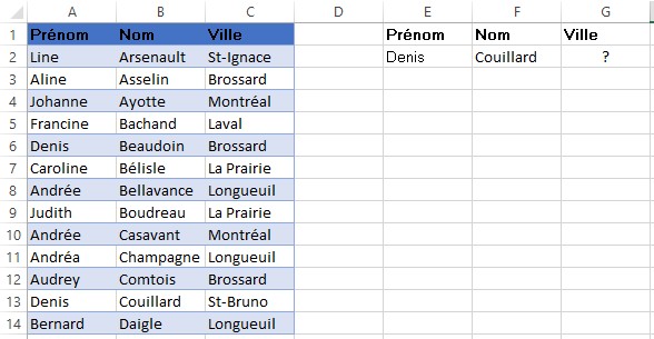 Vous êtes devant une liste d’informations. Vous connaissez le prénom et le nom de l’individu. Comment feriez-vous pour trouver sa ville ?